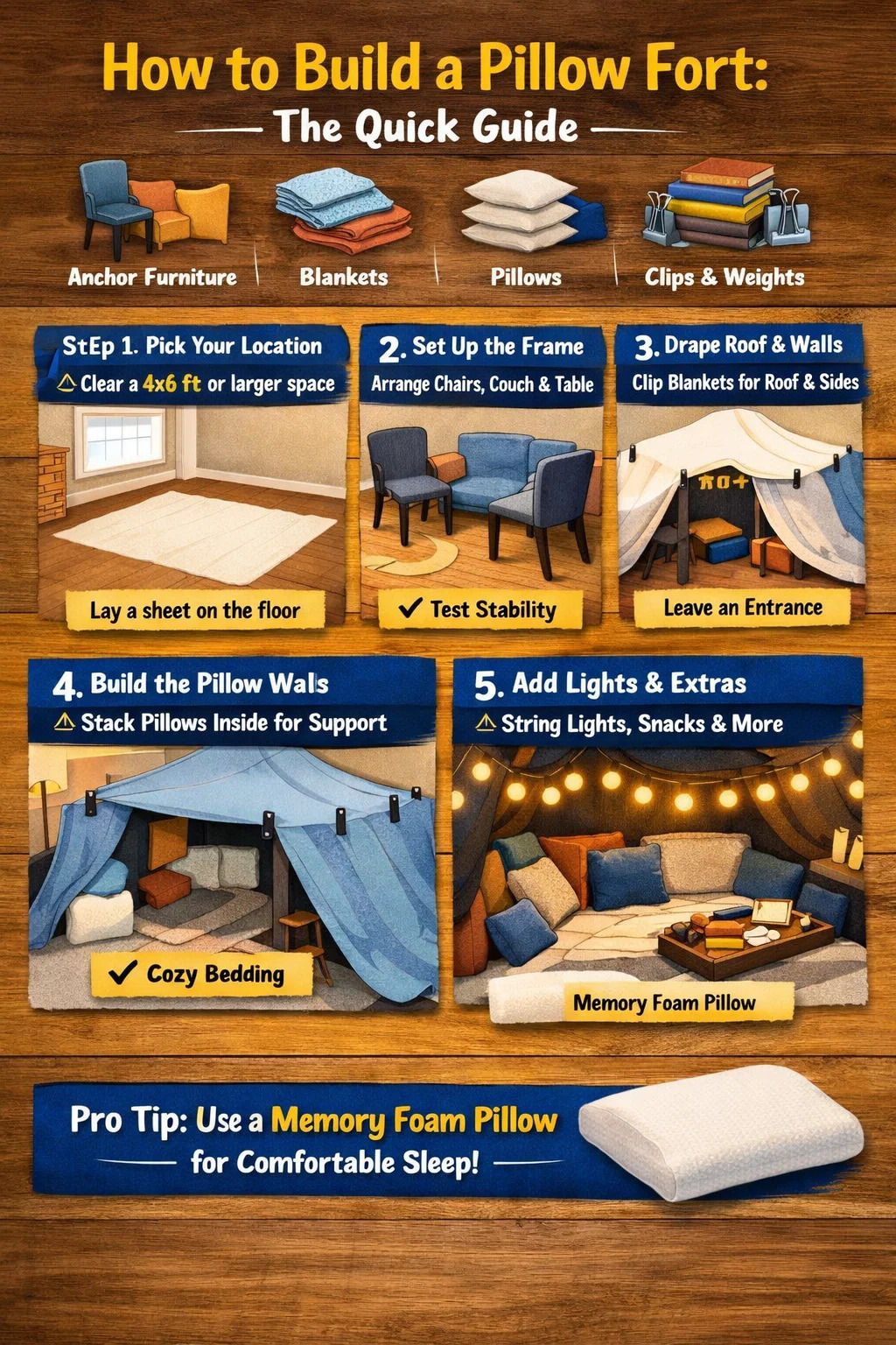 Do prawdziwego spania, a nie tylko leniuchowania, a rozdrobniona poduszka z pianki memory with adjustable fill jest najbardziej wszechstronną opcją. Dostosowuje się do różnych pozycji podczas snu, zapewnia stałe wsparcie przez całą noc i nie uciska płasko jak poduszki wypełnione poliestrem. Jeśli utrzymanie temperatury jest problemem w konfiguracji fortu, poduszka z pianki z pamięcią kształtu wypełnioną żelem działa chłodniej, zapewniając jednocześnie takie same właściwości wsparcia.