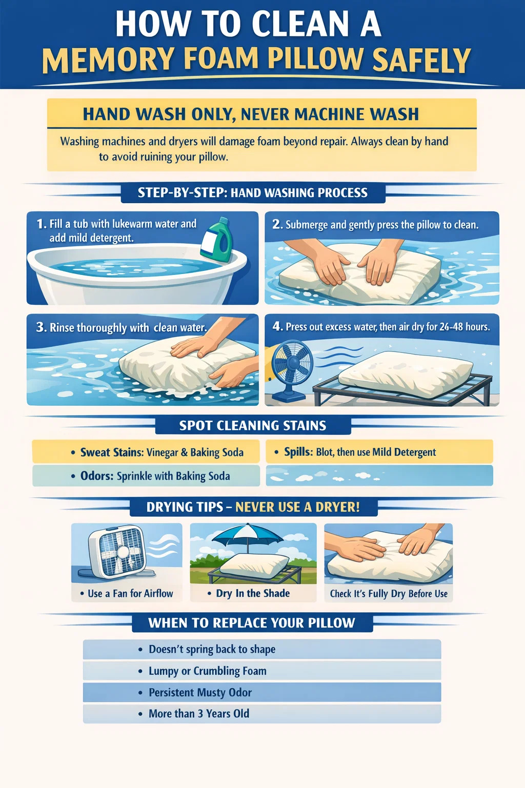 The correct method is hand washing with lukewarm water and a small amount of mild liquid detergent, followed by a long air-dry period — typically 24 to 48 hours. For spot cleaning between full washes, a mixture of water and white vinegar applied with a cloth works effectively on most stains without saturating the foam. W tym przewodniku szczegółowo opisano każdy scenariusz, od rutynowego odświeżania po dokładne czyszczenie mocno zabrudzonej poduszki z pianki memory.