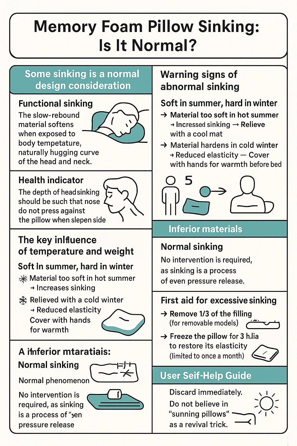 Pierwsza pomoc nad nadmiernym zatonięciem: → Usuń 1/3 napełniania (dla modeli zdejmowanych) → Umieść złożony ręcznik pod poduszką, aby uzyskać tymczasowe podparcie → Zamrozić poduszkę na trzy godziny, aby przywrócić jej elastyczność (ograniczoną do raz w miesiącu).