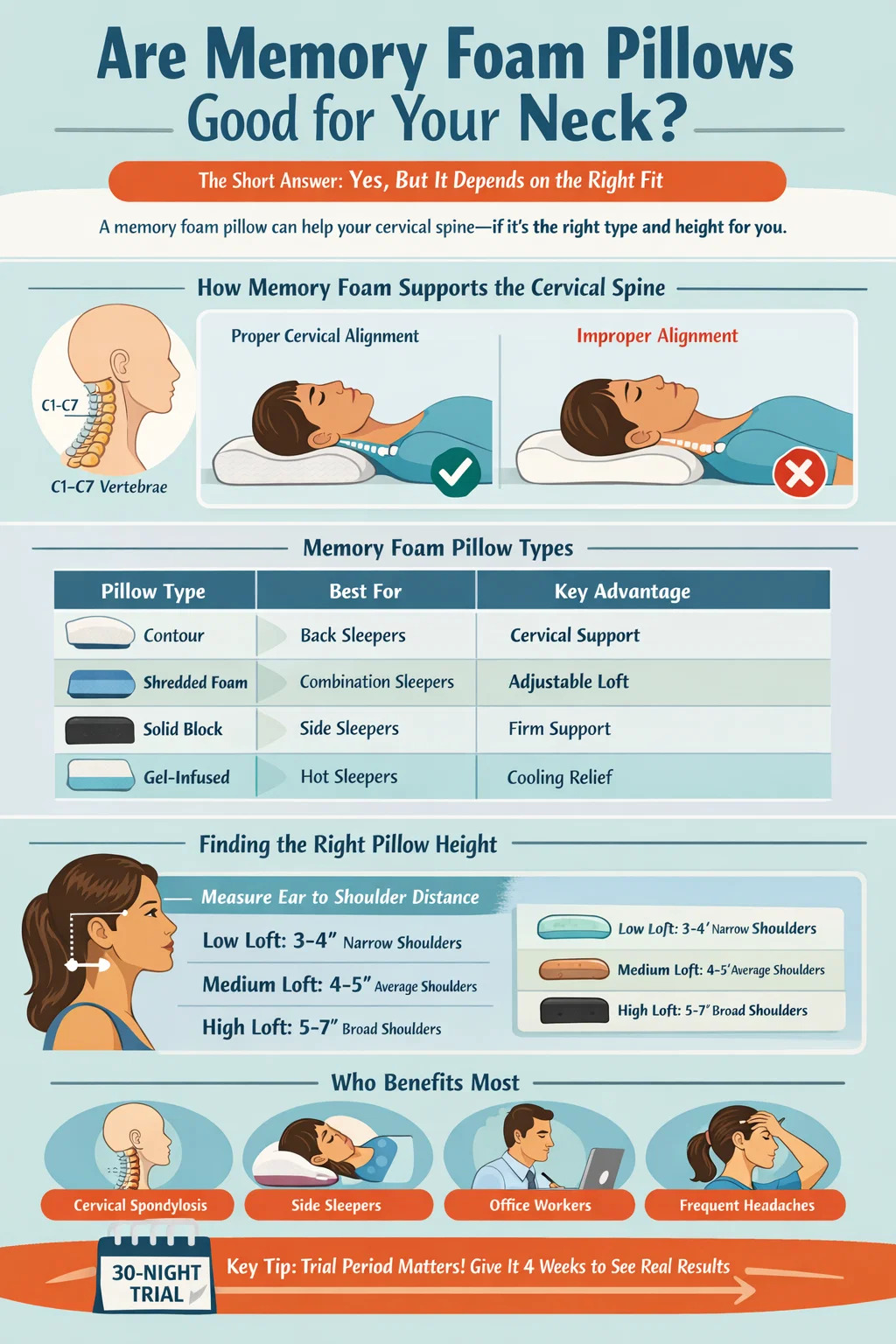 Wybierz poduszkę z pianki memory odpowiednią do pozycji snu i szerokości ramion, przetestuj ją przez 4 tygodnie i uczciwie oceń wyniki. Dla wielu osób ta pojedyncza zmiana powoduje wymierną i trwałą poprawę zdrowia szyjki macicy i ogólnej jakości snu.