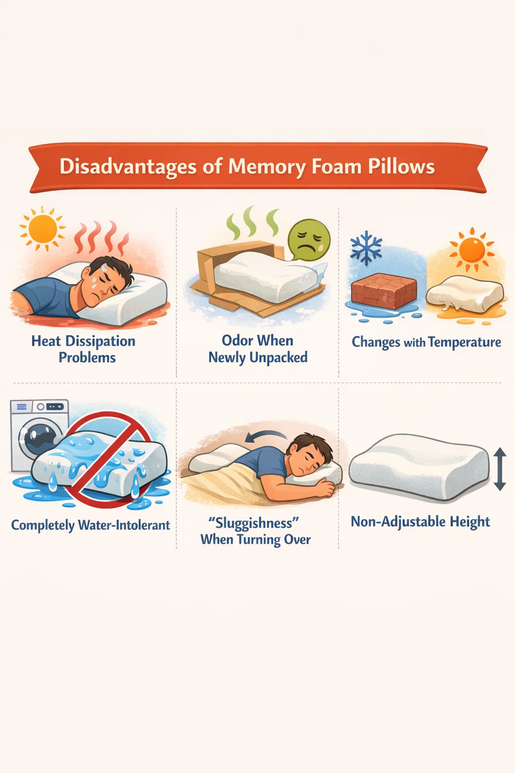 Twarde zimą, miękkie latem: W pomieszczeniu bez ogrzewania zimą poduszki z pianki memory mogą wydawać się twarde jak cegła, co wymaga „ogrzania” ich głową przez chwilę, zanim powoli zmiękną. W upalne lato może stać się zbyt miękki i pozbawiony wystarczającego wsparcia.